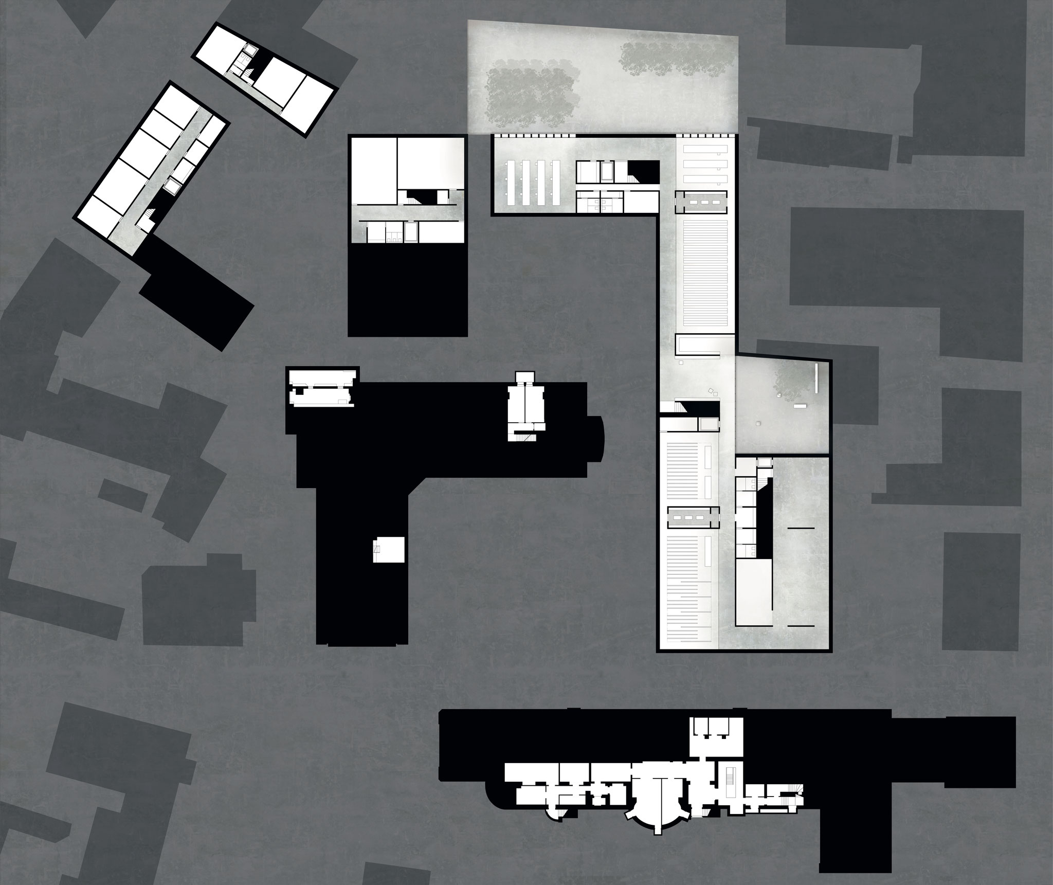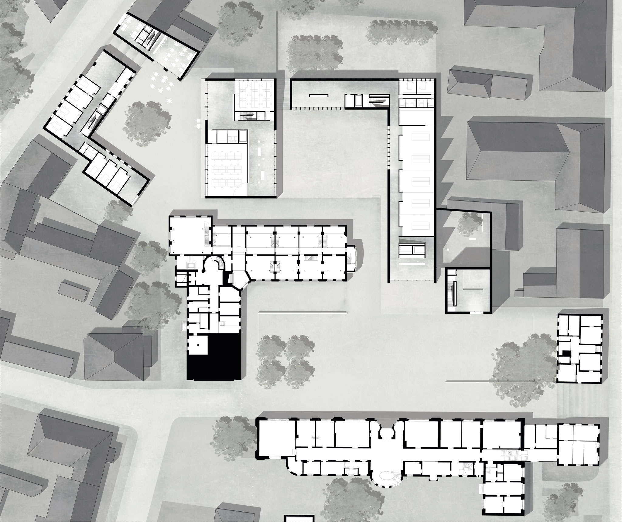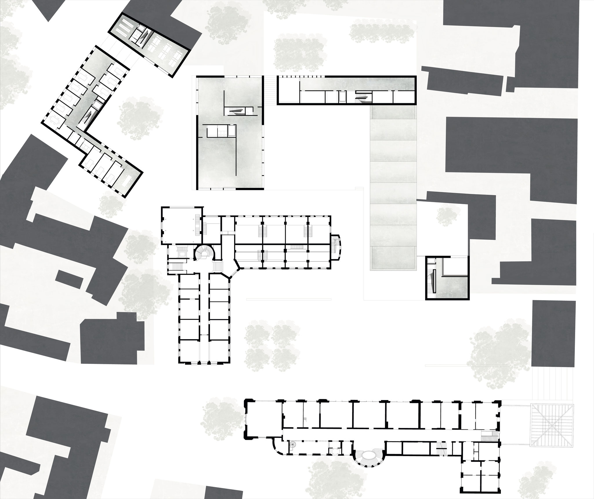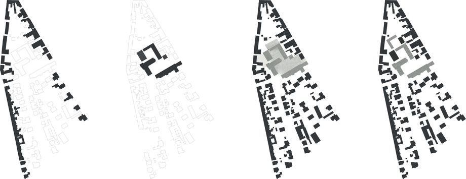 Die angrenzende Bebauung des Grundstücks weißt zwei verschiedene Strukturen auf. Zum einen bildet eine Randstruktur eine klare Kante nach außen und läuft in das Blockinnere ehr fransig aus. Zum anderen gibt es eine beginnende Reihe an raumschaf- fenden Großfiguren, wie das Hauptgebäude und dem Winkelbau, im Inneren des Blocks. Der Entwurf greift beide Strukturen auf. Während die Neubauten an der Amalienstraße das System der Randstruktur adaptieren, führt eine neue Großfigur die Sequenz der Van-de-Velde-Bauten fort. Das vorherrschende Raumprinzip ist das der Verengung und Aufweitung, sowohl im öffentlichen Raum, in dem jeder Platz und jeder Hof einen eigenen Charakter ausbildet, als auch in Bezug auf die Grundrisse der Bauten. Alle Flure münden in einem großzügigen Raum, ähnlich der Grundrisse der Bestandsbauten. Dieses Prinzip ermöglicht es, neben dem neuen Museumsbau, alle weiteren Neubauten zu Ausstellungszwecken zu nutzen, so wie es bereits regelmäßig im Hauptgebäude der Universität gebräuchlich ist.