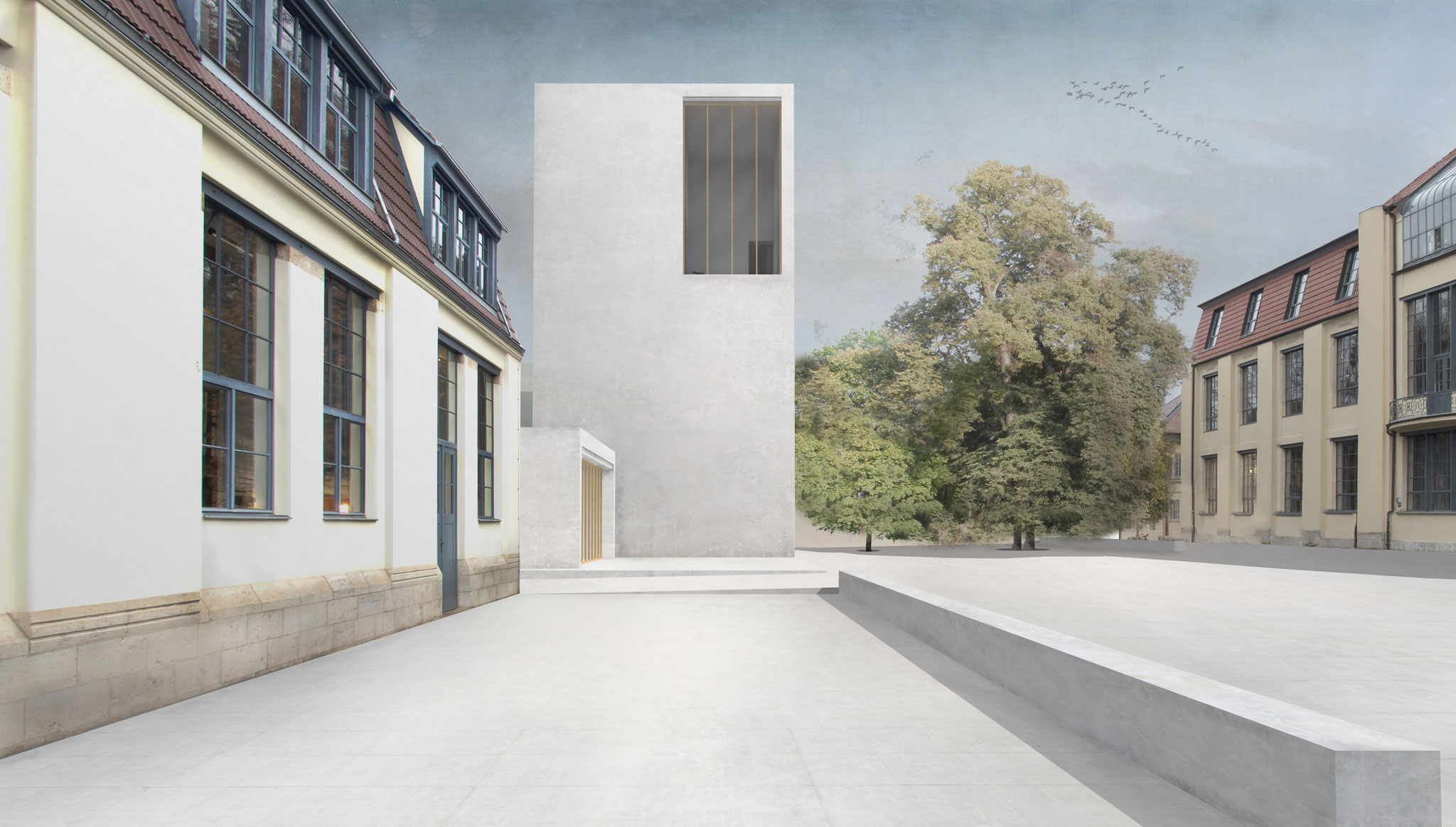Zentrum, und gleichzeitig Hochpunkt, des Entwurfs ist der Museumsturm. Oberirdisch beherbergt er eine einmal jährlich wechselnde Ausstellung studentischer Arbeiten und im Untergeschoss eine dauerhafte Ausstellung, die im direkten Zusammenhang mit dem Schauarchiv steht. Der Haupteingang zu den Ausstellungen erfolgt auf der Gegenüberliegenden Seite des Hauptgebäudes. Der Empfang ist Teil des Flurraums, der entlang der Metallwerkstatt und in die Obergeschosse zu den Fotostudios und einer weiteren Werkstatt führt. Ebenfalls zu der auf einem Sockel stehenden Großfigur gehörend ist das Bauvolumen für Studios und Co-Working-Space. Der Bau ist nicht nur flexibel, zur Arbeit oder für Ausstellungen, nutzbar sondern auch der Grundriss ist durch bewegliche Wände veränderbar. Der Neubau der Administration und ein Haus für Studenten, das neben Büros auch ein Café beinhaltet, bilden an der Amalienstraße eine neue Adresse und einen deutlichen Eingang zum Universitätsgelände aus.